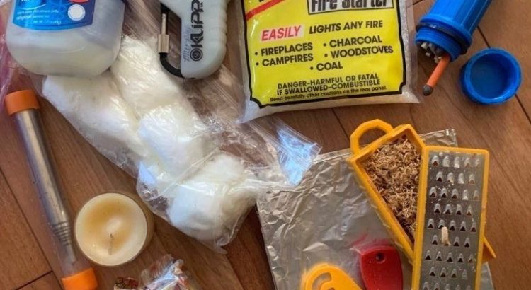 Fire starters (like petroleum jelly with cotton balls) Lighter and backup Storm proof wooden matches in waterproof holder